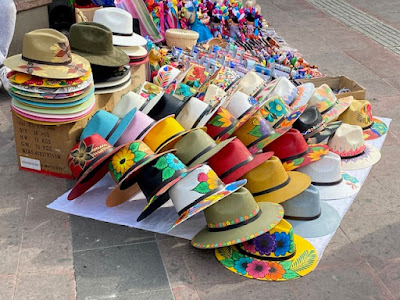 We arrived at Queretaro on Christmas Day. So the central park, decorated with Nativity scenes, was packed with people and merchants. We spotted colorful baby dolls and colorful hats for men, more than anything else.